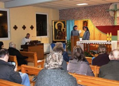 Das Auspacken, Montieren und Anziehen der Schrauben dauerte nur wenige Minuten. Unsere Liebe Frau nahm einen würdigen Platz neben dem Altar ein. Die Kapelle füllte sich mit den Gläubigen. Polen und Franzosen.